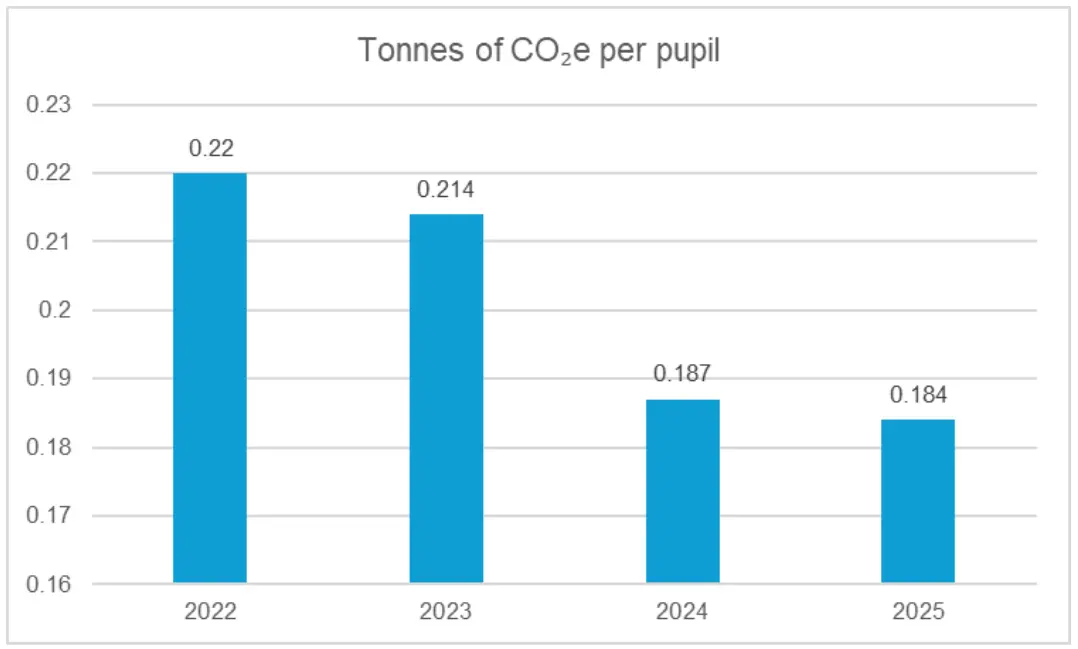 The report shows that almost all Trusts now sit within 0.1 to 0.3 tonnes of CO₂e per pupil, and Trust size has little impact on emissions. Critically, progress has stalled, with CO₂e per pupil in 2025 broadly unchanged from 2024. This is despite there being a 14% reduction in the official emissions factor for electricity as the UK grid transitions to renewables. It is likely, therefore, that energy usage by Trusts has in fact increased.